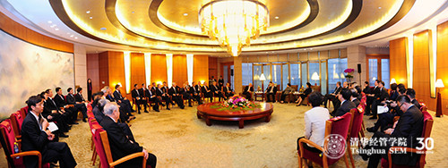 今年的顾问委员会会议是自清华经管学院顾问委员会2000年成立以来的第15次年度会议。今年是清华经管学院建院30周年,也是顾问委员会成立的第15个年头,顾问委员会在清华经管学院的快速发展和国际化进程中起到了重要作用。在一个多小时的会见中,朱镕基认真倾听了多位委员的发言。苹果公司首席执行官蒂姆•库克(Tim Cook)在发言中说,“我对钱院长对学院发展的远见留下了深刻的印象。学院的领导对学院的发展是非常重要的。我认为清华经管学院是世界上最棒的学院之一。”伟创力集团首席执行官迈克尔•迈克纳曼(Mike McNamara)在发言中赞赏清华x-lab(清华x-空间)的发展,他呼吁顾问委员们对清华x-lab予以更多的资金或者其他资源的支持,帮助清华的年轻学生创业发展。阿里巴巴集团执行主席马云表示自己特别荣幸能够做清华经管学院顾问委员会的委员,他说:“做经管学院的顾问委员不仅仅是帮助年轻人,对于我本人也是巨大的学习机会。”教育部部长袁贵仁谈到,教育部非常重视清华经管学院的一些做法,清华大学的很多改革都是在经管学院起步的,包括人事制度改革,教学方式改革和学生实习改革等。目前,教育部正在考虑今后把它作为清华的经验向全国进行推广。国务院副总理刘延东在总结顾问委员们的发言中指出,清华经管学院顾问委员会和清华经管学院不仅对清华大学的改革发展起到作用,对中国的教育也起到很大的推动的作用。清华经管学院顾问委员会对中国的教育,中国青年一代,中国与世界的联系将会产生长远的意义。