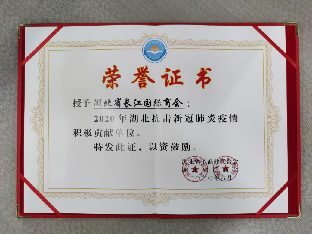 2020年7月7日,湖北省长江国际商会收到湖北省工商业联合会和湖北省总商会联合颁发的荣誉证书,授予湖北省长江国际商会“2020年湖北抗击新冠肺炎疫情积极贡献单位”称号,这是对商会团结带动全球会员企业积极驰援湖北抗疫的一种肯定。
