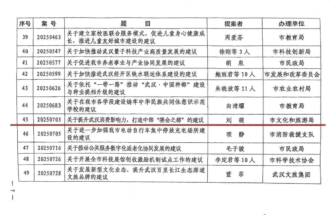 2026年1月5日,在政协武汉市第十四届委员会第五次会议期间,武汉市政协通报表扬了武汉市政协委员、湖北省长江国际商会会长刘萌所提《关于提升武汉消费影响力 打造中部“赛会之都”的建议》等49件2025年度好提案,这是他在本届武汉市政协履职中第二次获评年度好提案。