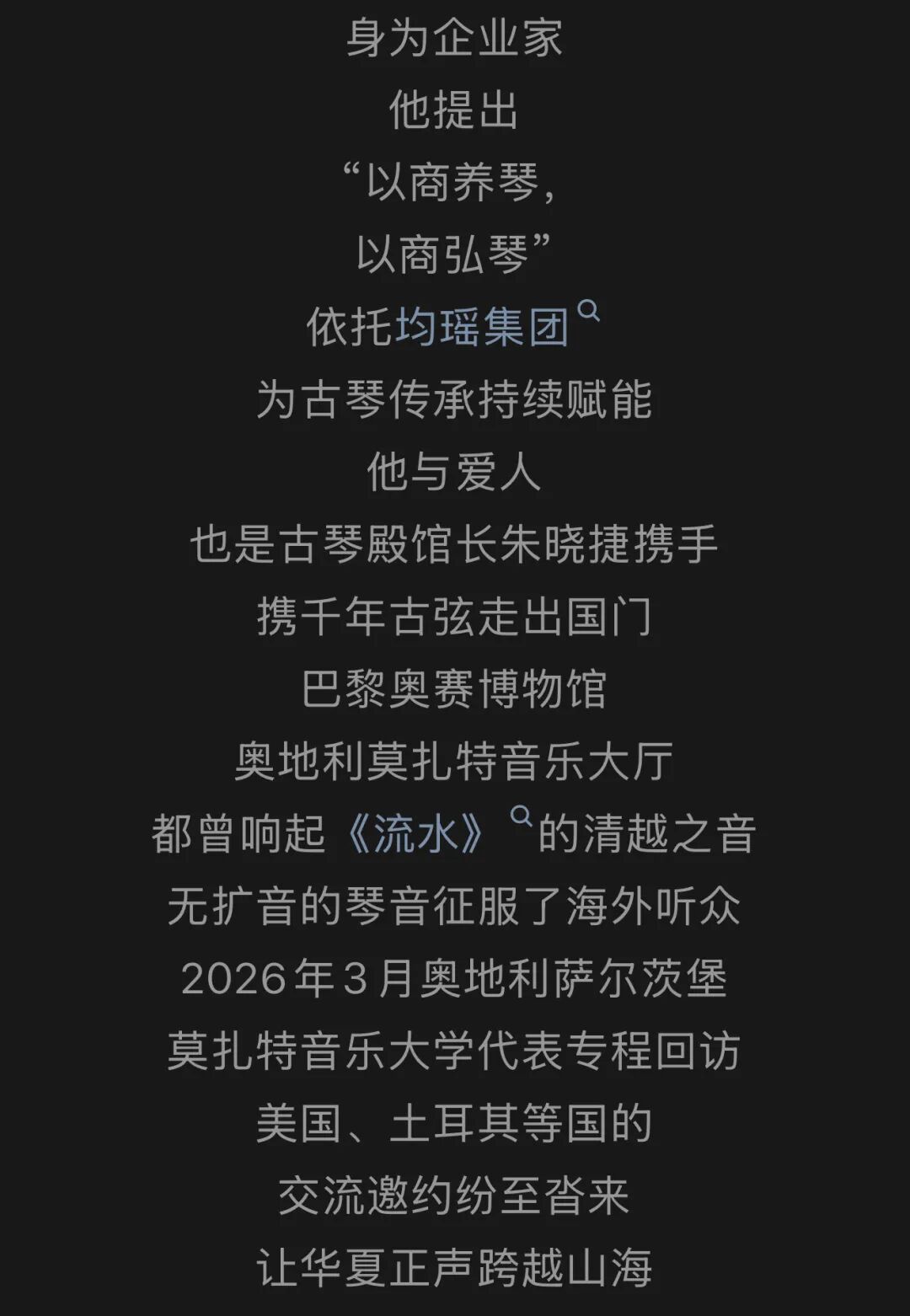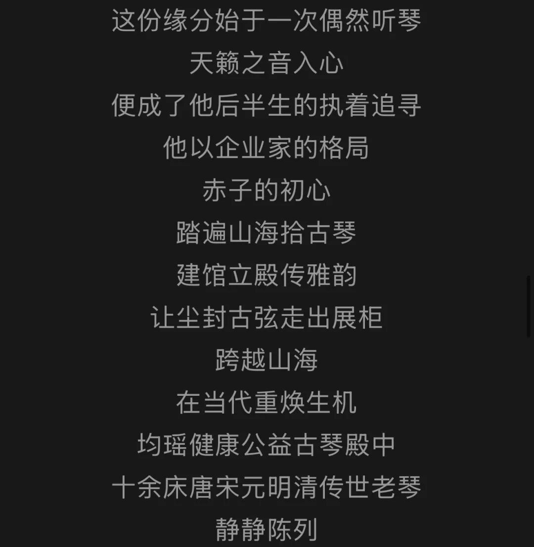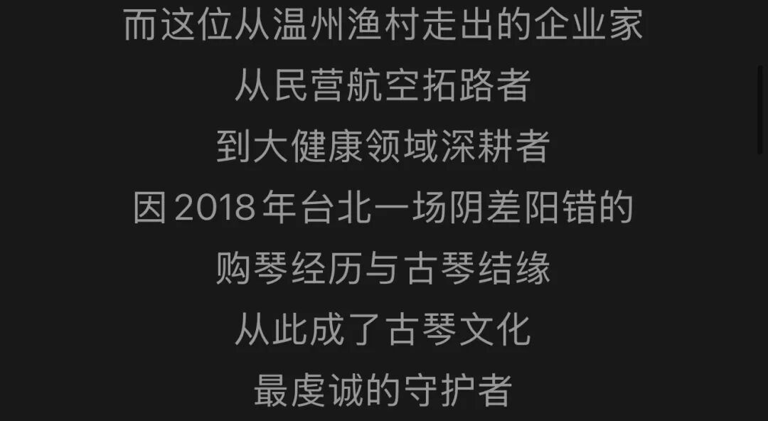 1972年生于温州苍南长江国际商会名誉会长均瑶集团总裁均瑶健康董事长含笑相迎暖意融融以馆藏古弦弹奏《梅花》清越琴音绕梁悠悠古意漫溢厅堂他谦称自己"乱弹琴"其实不然他弹起古琴也是一位好手琴声悠扬让人陶醉