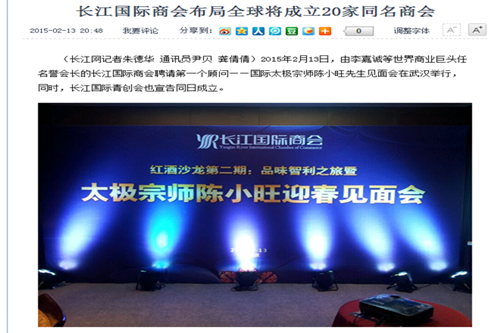 (长江网记者朱德华 通讯员尹贝 龚倩倩)2015年2月13日,由李嘉诚等世界商业巨头任名誉会长的长江国际商会聘请第一个顾问——国际太极宗师陈小旺先生见面会在武汉举行。