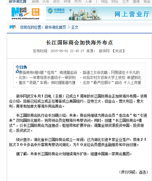 (新华网武汉)已成立1周年的长江国际商会正加快海外布局。该商会介绍,目前已经成立或正在筹备成立美国纽约、亚特兰大、旧金山、澳大利亚、意大利、南非和加拿大等海外同名商会。