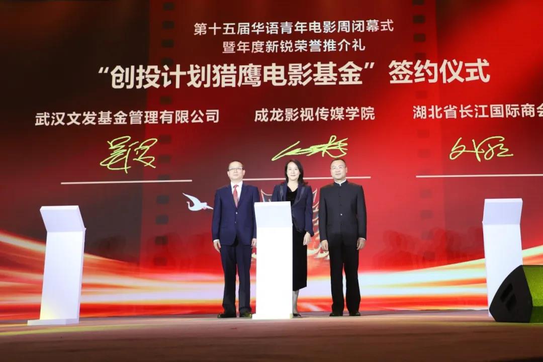 2020年10月27日,在武汉市会议中心举办的“第十五届华语青年电影周”闭幕式暨年度新锐荣誉推介礼上,湖北省长江国际商会与武汉文发集团、成龙影视传媒学院共同签约,发起设立“猎鹰电影基金”。湖北省长江国际商会会长、长江国际控股集团董事长刘萌,武汉文发基金管理有限公司董事长吴波,成龙影视传媒学院创办人魏彬作为三方代表进行了签约。