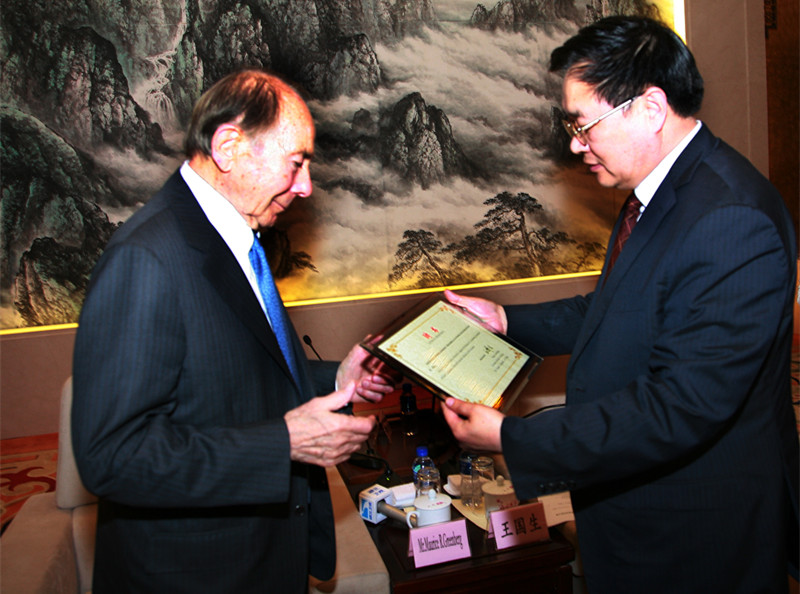 图说:时任湖北省省长王国生向格林伯格主席颁发省长经济顾问聘书