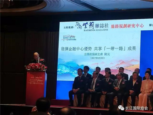 陈元副主席在演讲中指出,香港作为国际金融中心,既是中国的,亚洲的,也是世界的,在国家经济转型和实现“一带一路”倡议中具有独特优势,应该扮演更重要的角色、发挥更大的作用,香港应建成21世纪海上丝绸之路的金融枢纽,建成“一带一路”投融资的国际平台,建成金融服务国家战略的集效阵地。他坚信,有伟大祖国的坚强后盾,有中央政府和全国人民的大力支持,有香港特别行政区政府和各界人士的团结奋斗,香港一定能够在服务国家的同时实现自身更好发展,再创新的辉煌。