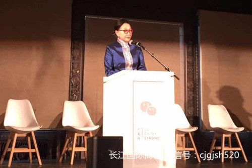 图说:长江国际商会名誉会长、中美强项目发起人之一方李邦琴在「微信·中美强」合作启动仪式上致辞
