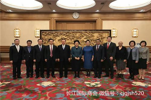 图说:国务院副总理刘延东与长江国际商会名誉会长方李邦琴、长江国际商会执行会长刘萌交谈
