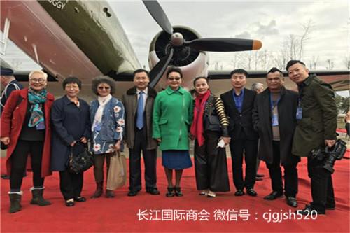 图说:长江国际商会名誉会长方李邦琴(右五)和长江国际商会执行会长刘萌(右六)等人在捐赠美国飞虎队的一架C-47运输机现场合影