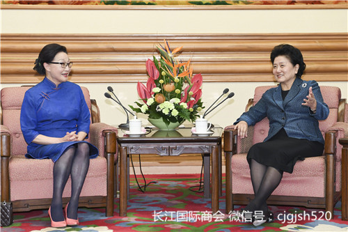 图说:国务院副总理刘延东和长江国际商会名誉会长方李邦琴会谈