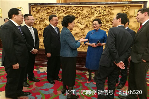 图说:国务院副总理刘延东与长江国际商会名誉会长方李邦琴、长江国际商会执行会长刘萌交谈