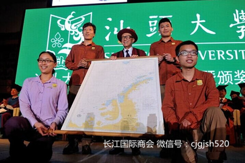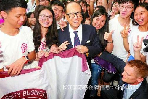 图说:长江国际商会名誉会长李嘉诚(中)和学生们