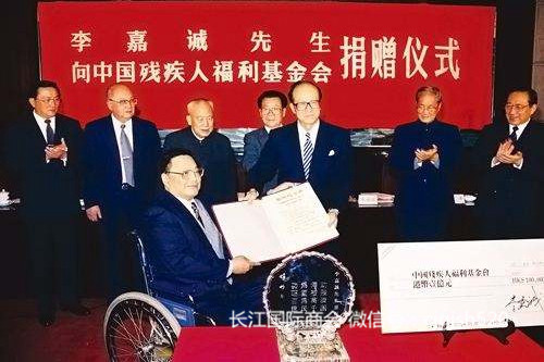 图说:长江国际商会名誉会长李嘉诚(左三)向中国残疾人福利基金会捐赠仪式(资料图)