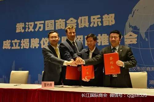 图说:长江国际商会、中国商协会联盟、俄中理事会和武汉万国商会俱乐部签约
