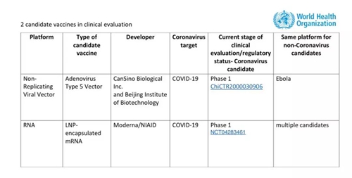 根据WHO于3月20日发布的有关全球新冠疫苗临床的最新动态,一个来自中国由陈薇院士领导的候选新冠疫苗与一个来自美国的候选新冠疫苗已经进入一期临床试验,另外还有42个候选新冠疫苗处于临床前评估中。