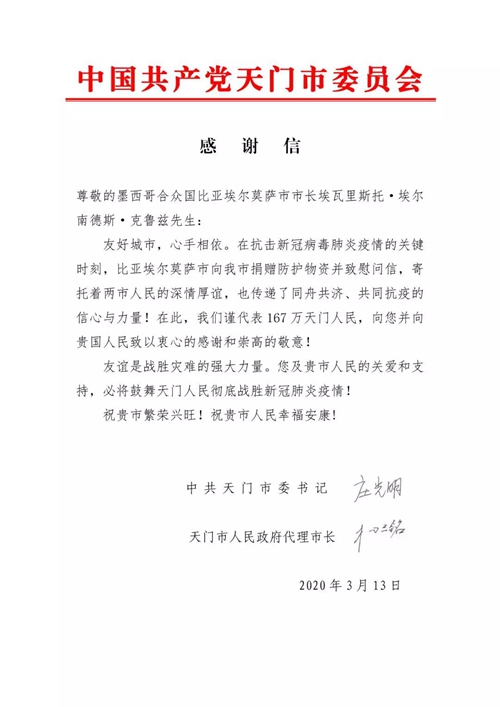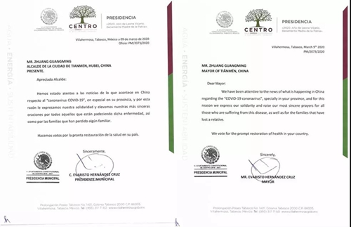 2020年3月12日,墨西哥比亚埃尔莫萨市市长埃瓦里斯托·埃尔南德斯·克鲁兹,通过长江国际商会会长刘萌向湖北省天门市市委书记庄光明发来了一封慰问信。他在信中说到:“我们非常关注中国在冠状病毒方面的最新消息,特别是您所在的省和市,我再次表示问候与声援,并向所有遭受这种疾病困扰的人,以及对因此疾病失去亲人朋友的家庭,致以最诚挚的祈祷,希望您们迅速战胜疫情!”