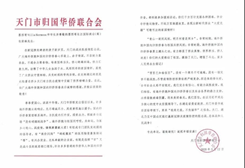 天门市归国华侨联合会也专门向墨西哥长江国际商会和比亚埃尔莫萨市致函表达谢意,信中说,“青山一道同风雨,明月何曾是故乡。非常时期,海外侨胞和国内归侨侨眷与祖国共担风雨,勇立潮头,彰显了侨众真情、侨界担当、侨人速度,您们大爱感动了祖国,激励了天门,增强了斗志,家乡人民将永生铭记!雪里已知春信至,没有一个寒冬不可逾越,没有一场灾难不能战胜。”