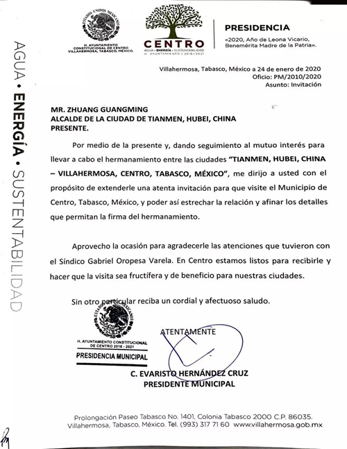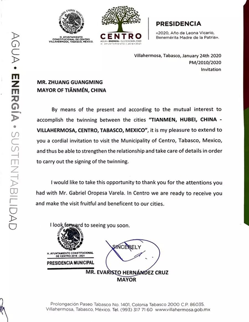 图说:墨西哥Villa Hermosa市长Evaristo先生给天门市委书记庄光明先生的访问邀请函