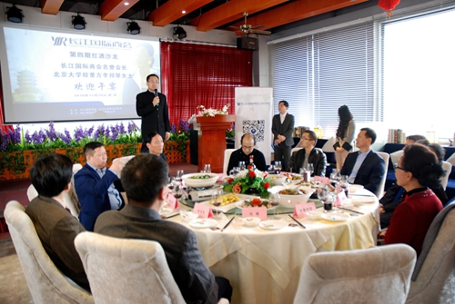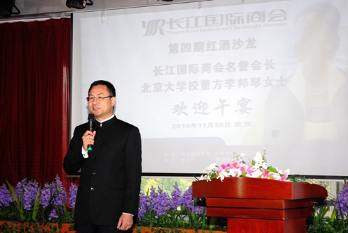 2016年11月20日,长江国际商会在武汉长江江畔的润恬元酒店举办了第四期红酒沙龙暨长江国际商会名誉会长、北大校董方李邦琴欢迎午宴活动,长江国际商会执行会长、北大湖北校友会会长刘萌,武汉市外侨办主任安卫东,武汉市委统战部原巡视员、副部长汪海鹰,美国楚天集团董事长、美中文化传播协会会长宋敏,和长江国际商会红酒俱乐部主任、厦门建发国际酒业集团总经理齐玉军和北京大学湖北校友会副会长吴淮平、黄雍、杨裕利、韩晓光、徐风、刘崇中等,以及北大校友和商会会员近五十人参加了活动。