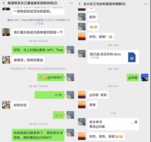 2月15日,长江产业基金股东及陈道明捐助武汉协和医院群,被迅速建群。第一批货物:杜邦TYVEK500防护服500套,N95口罩1000个,外科手术口罩2000个,医用手套5000副,在唐亮董事长和刘萌会长的亲自安排下,从上海发往武汉协和医院。包括医用外科口罩2000个和5000副医用手套在内的第二批医疗援助物资,正在北京清关,将源源不断地运向武汉。