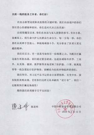 陈道明也向武汉同济医院抗疫一线的医务工作者发来慰问信,他说:“我们在后方,更一直思考如何尽一份绵薄之力,为配合打赢这场生死阻击战。我们坚信,有习近平总书记的亲自部署指挥,有党中央、国务院的英明决策,更有你们这样无私奉献的逆行者,我们一定能赢!您们是时代真正的英雄!”