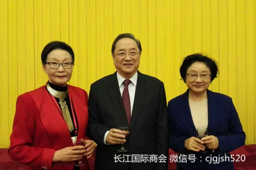图说:中共中央政治局常委、全国政协主席俞正声(中),全国政协副主席李海峰(右)和长江国际商会名誉会长方李邦琴(左)