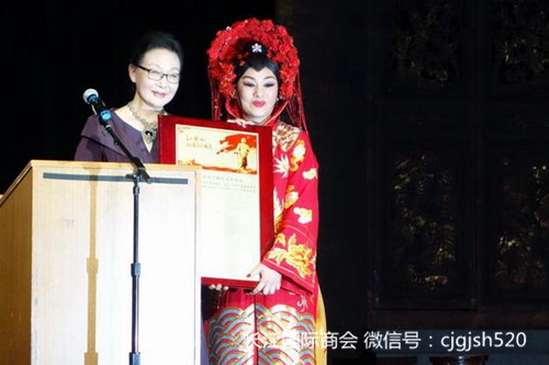 图说:长江国际商会名誉会长方李邦琴向武汉京剧院院长暨京剧《三寸金莲》主演刘子微颁发祝贺状