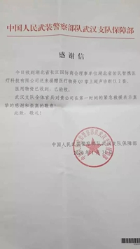 2020年1月31日,吴昊理事赶赴硚口区长丰乡常码头村,进行了第一笔设备捐赠,向中国人民武装警察部队武汉市支队赠送了2台启佑Q7掌式超声诊断仪,为战斗在抗击疫情前线的广大武警官兵提供医疗设备支持。