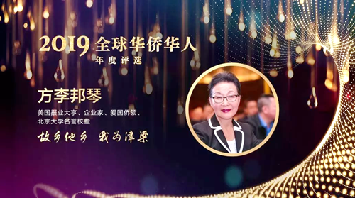 2020年1月8日,“2019全球华侨华人年度评选”颁奖典礼在北京钓鱼台国宾馆举行。方李邦琴获“2019全球华侨华人年度人物”。