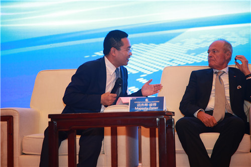 图说:马耳他前总理劳伦斯·贡奇和刘萌会长握手