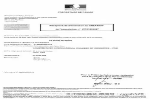 2016年9月7日,长江国际商会全球第八家同名商会被法国巴黎警察总局正式批准成立,批准文件号码为W51235327,这家由法国政商领袖发起并在当地合法注册的法人社团的注册完成,标志着以独有“全球商会集团”模式打造的长江国际商会从法律上落户法国。