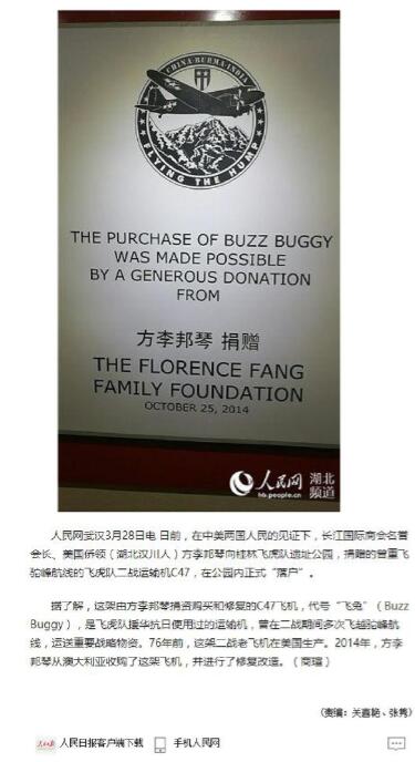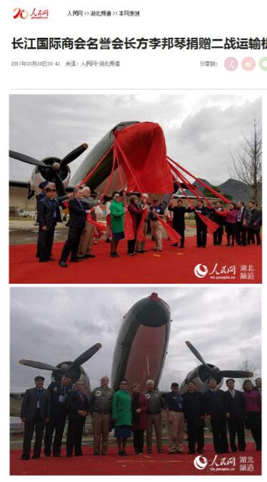 人民网:长江国际商会名誉会长方李邦琴捐赠二战运输机