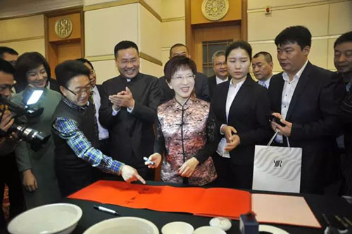 洪秀柱是中共十九大以后,国民党蓝营高层到访中国大陆的第一人。现场她亲自为长江国际商会题词:两岸一家亲。