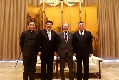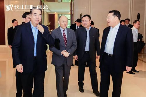 图说:湖北省人民政府副省长赵海山(左一)、长江国际商会会长刘萌(左二)、长江国际商会名誉会长霍震寰(右二)、长江国际商会秘书长王雅玉(右一)